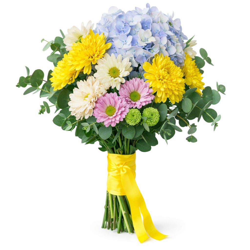 Гортензия голубая, хризантема кустовая желтая, белая и розовая, эвкалипт. Упаковка (лента, пленка, крафт, сетка, пленка матовая)