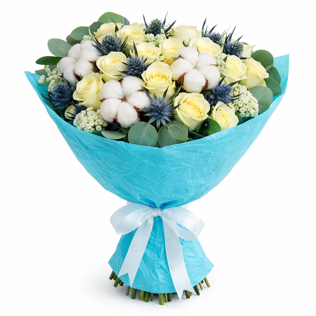 Кремовые розы, дополненные нежным хлопком и экзотическим эрингиумом, создают изысканную композицию. Белая статица и эвкалипт придают букету воздушность и легкость. Упакован в голубую матовую пленку и перевязан белой атласной лентой. Возможны альтернативы оформления: крафт-бумага или декоративная сетка. Прекрасный выбор для поздравления на день рождения или для любимой.