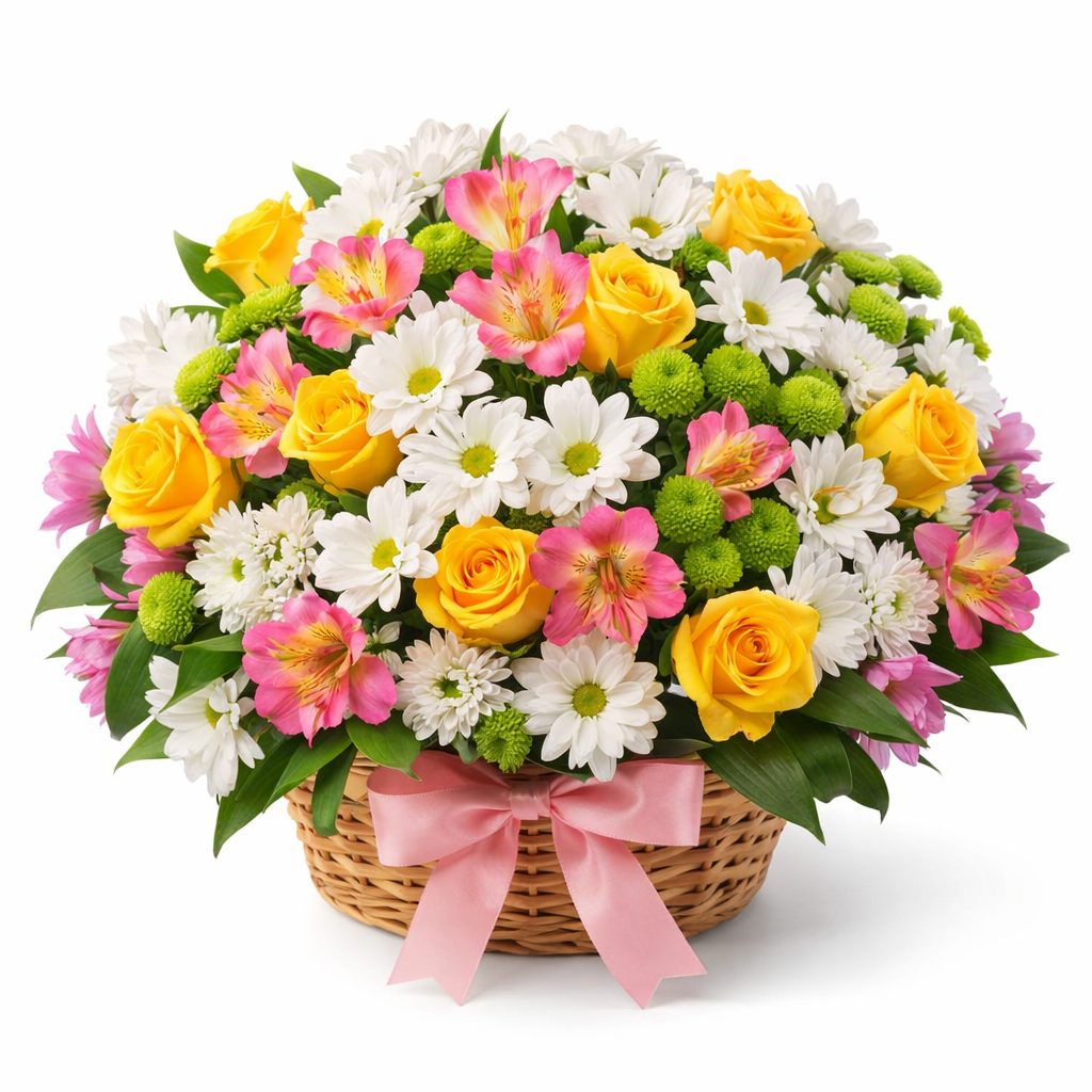 Яркая композиция из желтых роз, розовых альстромерий и белых хризантем с добавлением зеленых акцентов создаёт атмосферу радости и тепла. Цветы аккуратно размещены в плетёной корзине, что придаёт им особую изысканность. Альтернативное оформление возможно в корзине из лозы или ротанга. Прекрасный подарок для мамы на день рождения или юбилей.