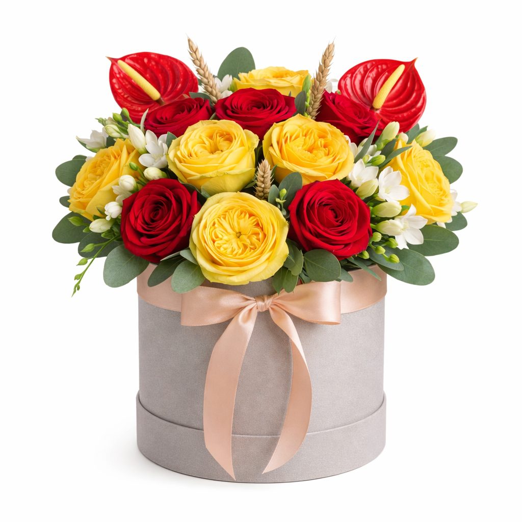 Яркая композиция из пионовидных жёлтых и красных роз, белой фрезии, антуриума и сухоцветов, дополненная зеленью, создаёт атмосферу радости и тепла. Цветы расположены в элегантной шляпной коробке, подчёркивающей их изысканность. Возможны варианты оформления в бархатной или дизайнерской коробке. Прекрасный подарок для любимой на день рождения или годовщину.