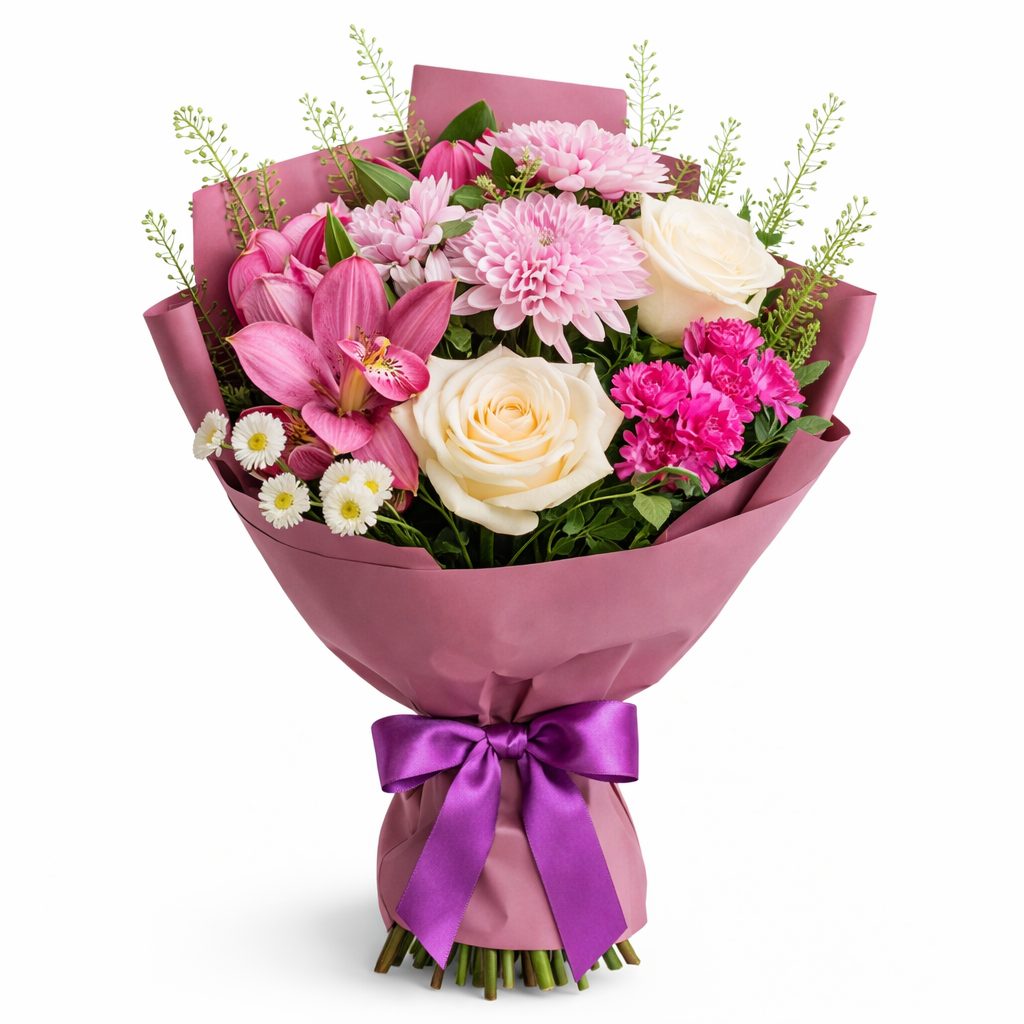 Розовая орхидея, белая и сиреневая кустовая хризантема, розовая кустовая роза, белая одноголовая роза и вереск создают гармоничную композицию. Букет оформлен в матовую пленку розового оттенка и перевязан атласной лентой. Возможны альтернативы упаковки: крафт-бумага или декоративная сетка. Подойдёт для поздравления на день рождения или для любимой.