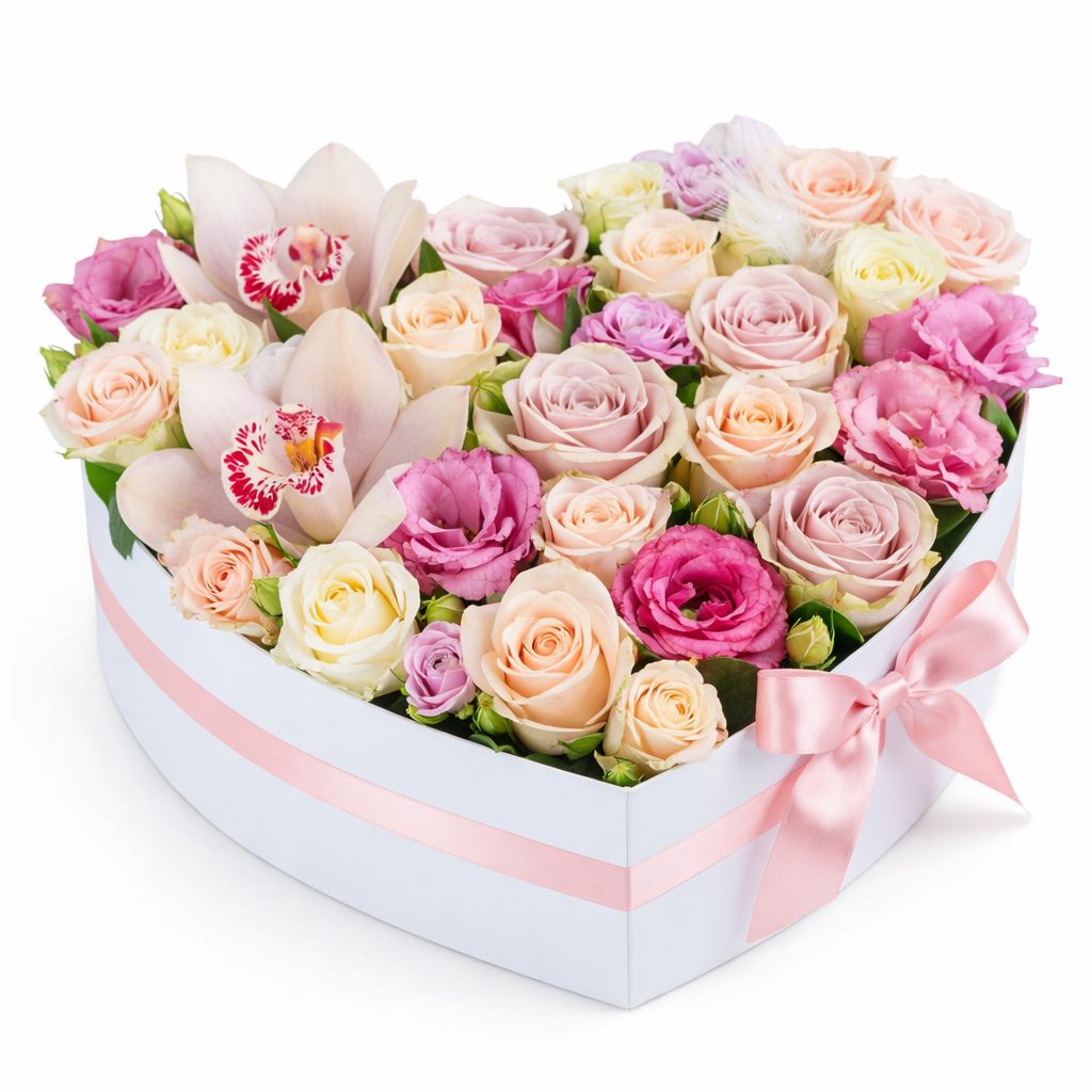 Белоснежные орхидеи, розовые кустовые розы и лиловая эустома создают нежную и романтичную композицию. Упакованы в изящную коробку в форме сердца, которая подчёркивает утончённость букета. Возможны альтернативы оформления в бархатной или атласной коробке. Прекрасный подарок для любимой на годовщину или свадьбу.